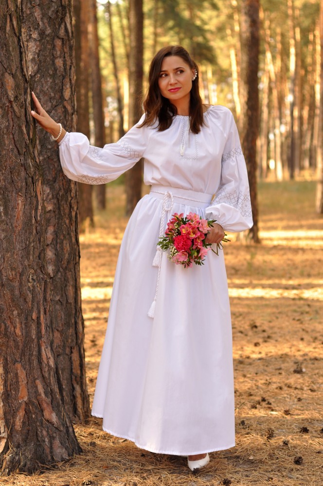 Весільний комплект - білосніжна вишита сукня з бавовни та класична чоловіча сорочка з лаконічною вишивкою